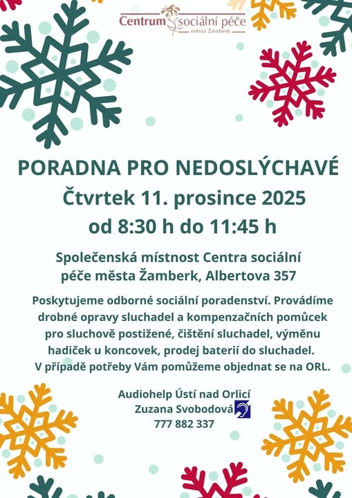 V případě potřeby je možno kontaktovat paní Zuzanu Svobodovou, z poradenského střediska pro nedoslýchavé Audiohelp Ústí nad Orlicí, telefonicky na tel. čísle 777 882 337 nebo emailem audiohelpuo@seznam.cz.