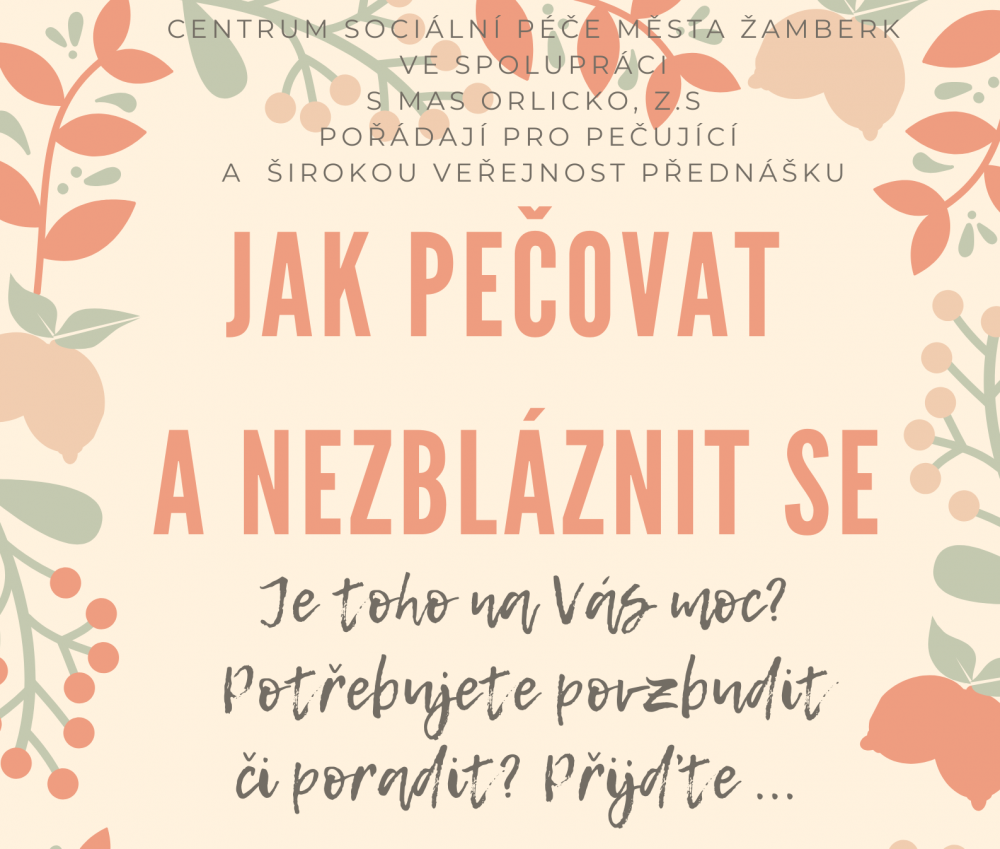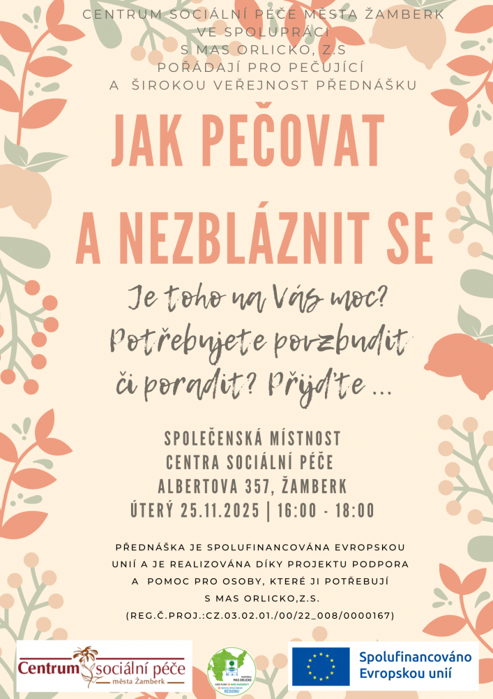 Přednášku realizuje Centrum sociální péče města Žamberk ve spolupráci s MAS Orlicko. Setkání povede zkušená lektorka Tatjana Kašlíková. Dozvíte se, jak o sebe pečovat, jak nevyhořet a jak se mít rád.