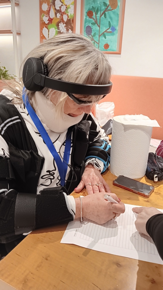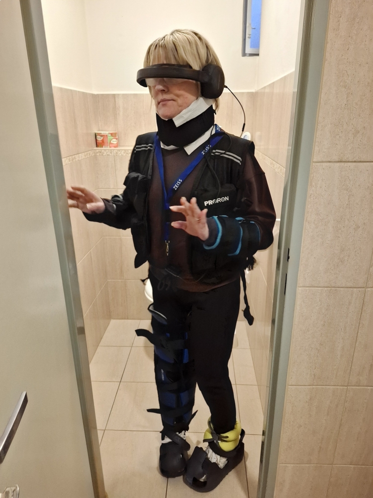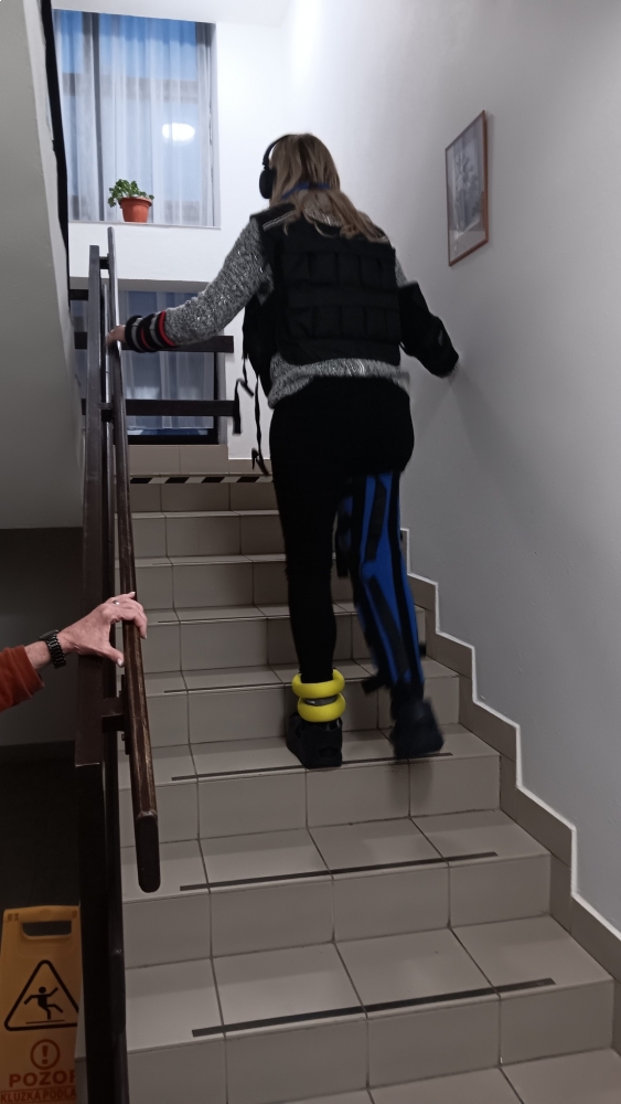 Gerontooblek - speciální oblek se závažím, ortézami, upravenými brýlemi a sluchátky nám ukázal, jak náročné mohou být i zdánlivě jednoduché činnosti. Chůze po místnosti, vstávání ze židle nebo manipulace s drobnými předměty najednou vyžadovaly mnohem více času, soustředění i energie.